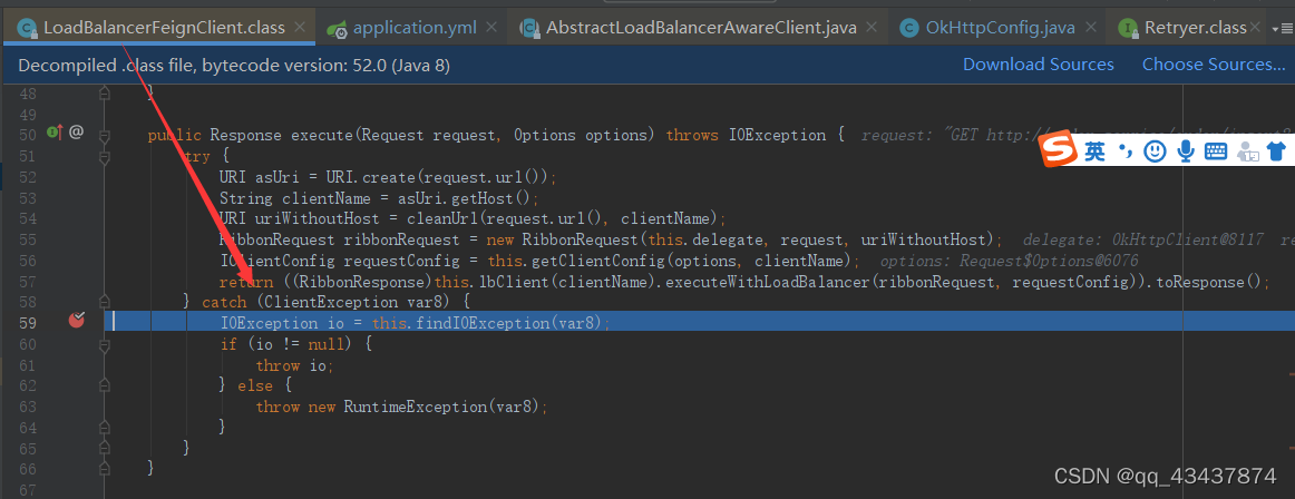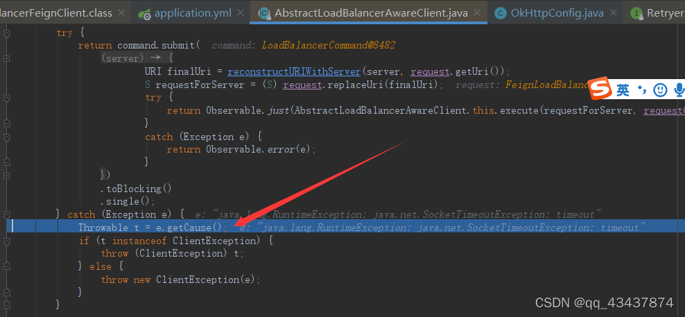 ClientException又会被负载均衡客户端的execute 方法捕获到。因为SocketTimeoutException 也是IOException,直接会直接抛出IOException。