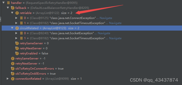 可以看到,RequestSpecificRetryHandler代理了一个RetryHandler,默认是DefaultLoadBalancerRetryHandler,看他们的参数,可以知道,默认 Ribbon 重试机制也是关闭的。