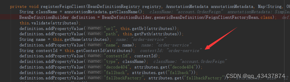 接着就是registerFeignClient 注册客户端了,首先会将注解属性添加到definition中,这里 url、path 没有配置,所以都为空,然后注意contextId,没有配置时,默认使用 name 属性,这也就是为啥多个同名的@FeignClient,没有指定contextId会报错的原因了。