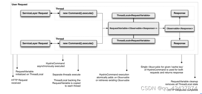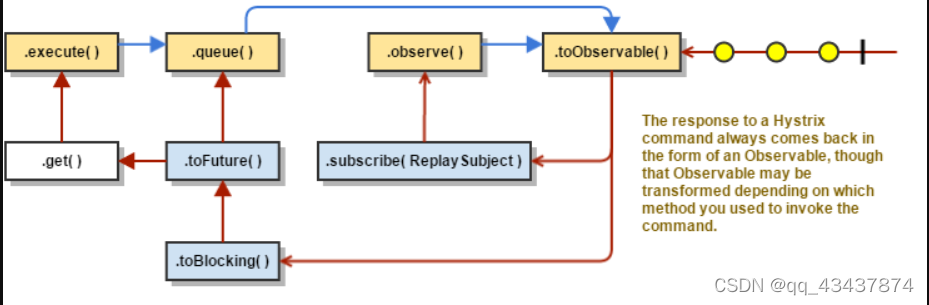 同步调用执行的execute()、queue().get(). queue()方法最终调用是的toObservable().toBlocking().toFuture(),也就是说,最终每个HystrixCommand都由一个Observable实现支持。