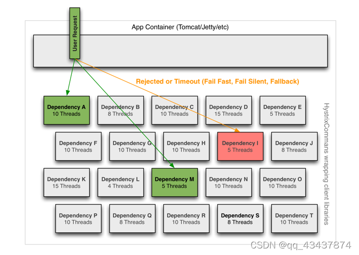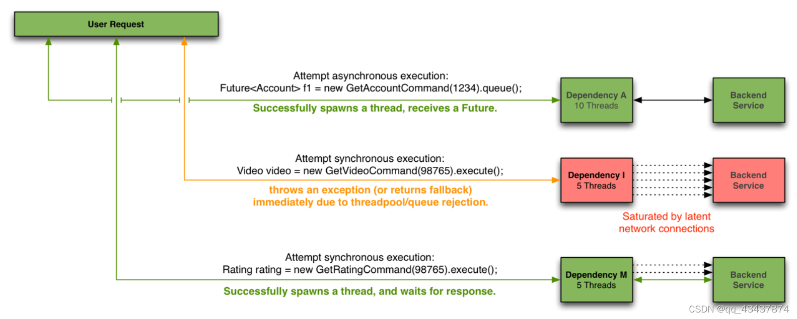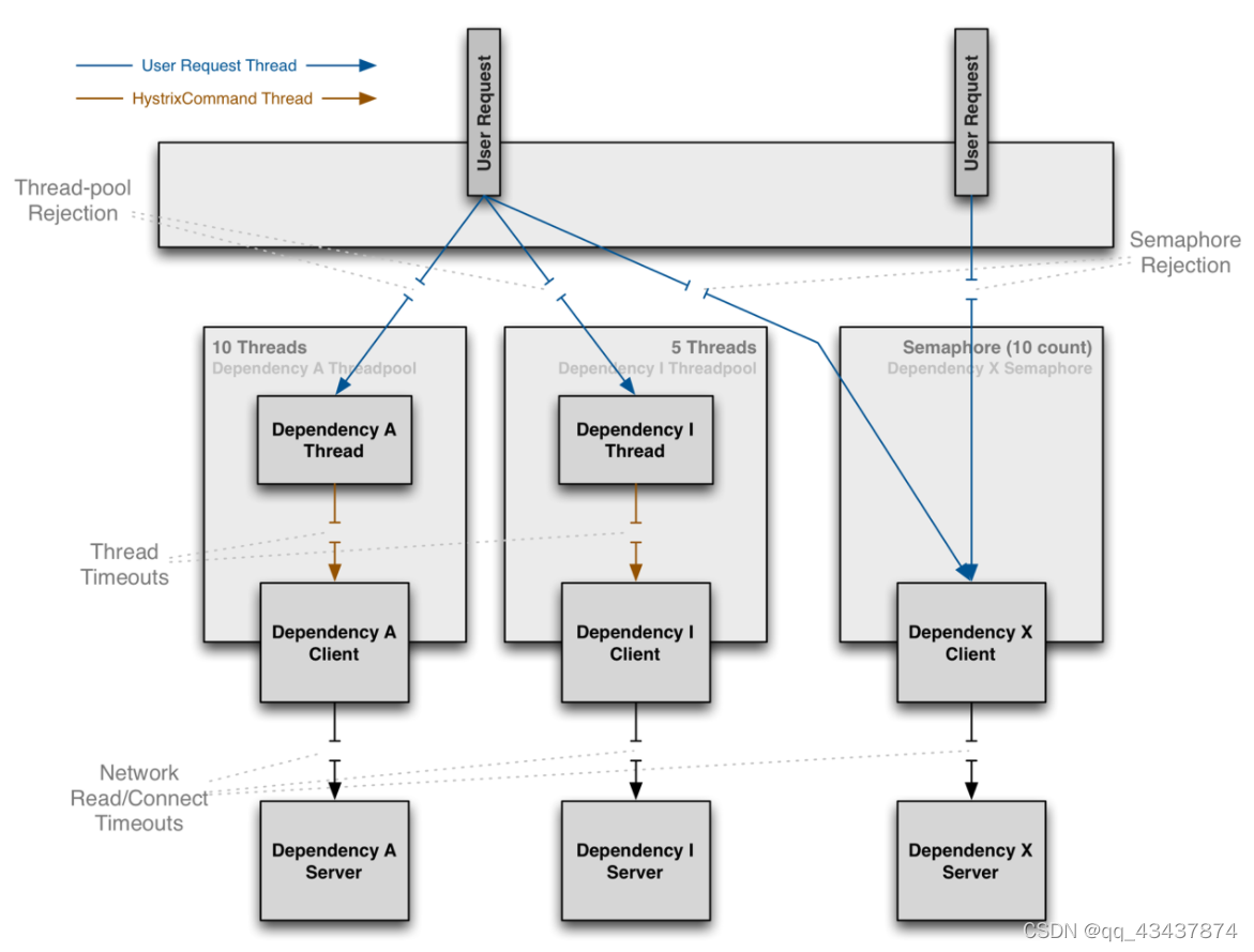 Hystrix 使用单独的、每个依赖项的线程池作为约束任何给定依赖项的一种方式,因此底层执行的延迟将仅使该池中的可用线程饱和。