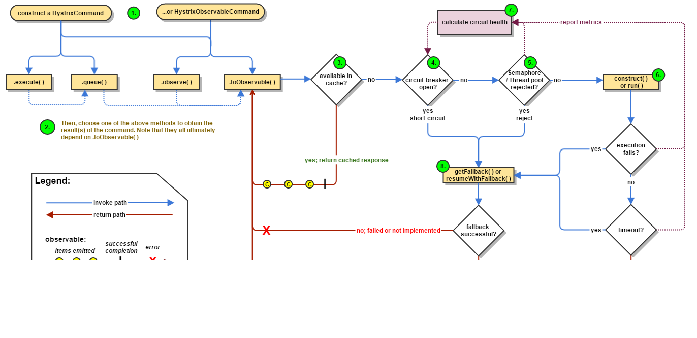 如果电路打开(或 “跳闸”),则 Hystrix不会执行命令,但会将流程路由到(8)Get the Fallback。